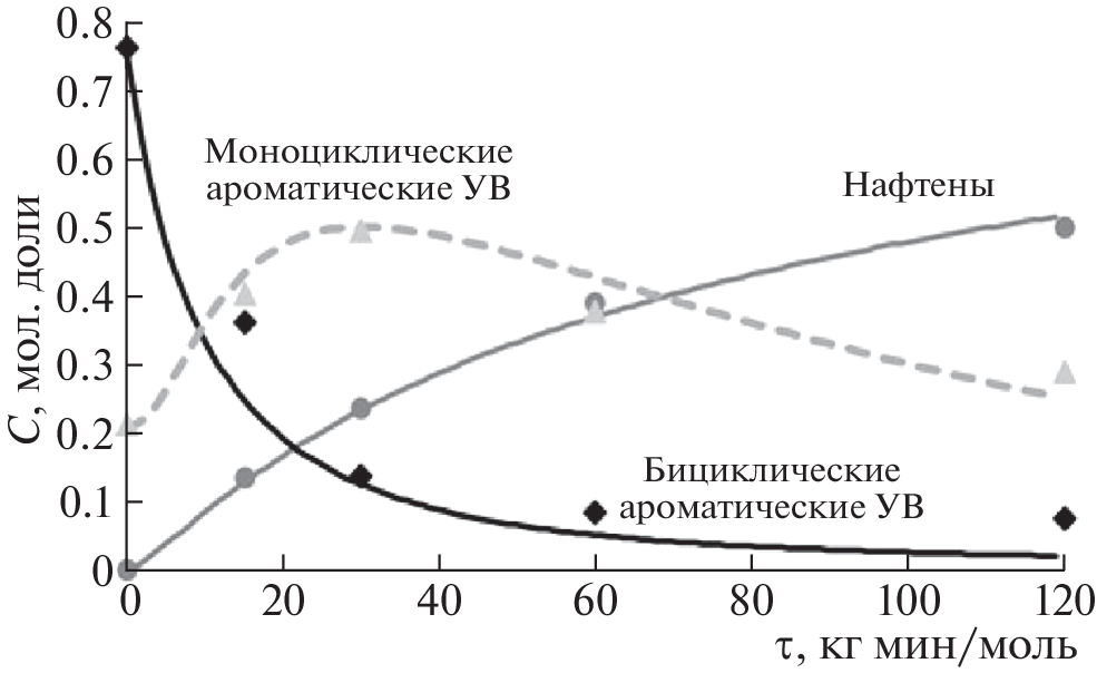 A mathematical analysis of the process for the preparation of high-density jet fuels of T-6 and T‑8V grades, based on hydrogenation of polycyclic aromatic (mostly bicyclic) hydrocarbons, has been performed. The process was carried out on a pilot laboratory plant using two nickel catalysts: Raney nickel and nickel on kieselguhr. The experimental data obtained for temperatures of 200–400°C and different feed space velocities were used to construct a mathematical model for catalytic hydrogenation of hydrocarbons that allows for changes in the volume of the reaction mixture. The concentrations of mono- and bicyclic aromatic hydrocarbons (initial and intermediate compounds) and naphthenes (target products) obtained within the framework of the mathematical model are in good agreement with the measured concentrations. The solution of the inverse kinetic problem made it possible to estimate the kinetic parameters of the main chemical transformations in the hydrogenation of aromatic hydrocarbons.