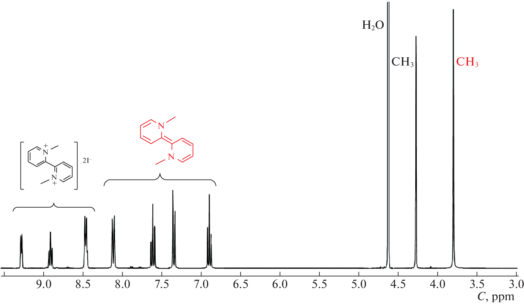 The electrochemical properties of N-substituted salts of 2,2'-bipyridine: N-methyl-2,2'-bipyridinium iodide and N,N '-dimethyl-2,2'-bipyridinium iodide were studied by cyclic voltammetry (CV). The electrochemical properties are greatly affected by the methyl substituents at the nitrogen atom in the ortho-bipyridine molecule. The conproportionation constants were calculated for N,N '-dimethyl-2,2'-bipyridinium iodide and made it possible to judge about the degree of electron localization in the systems.