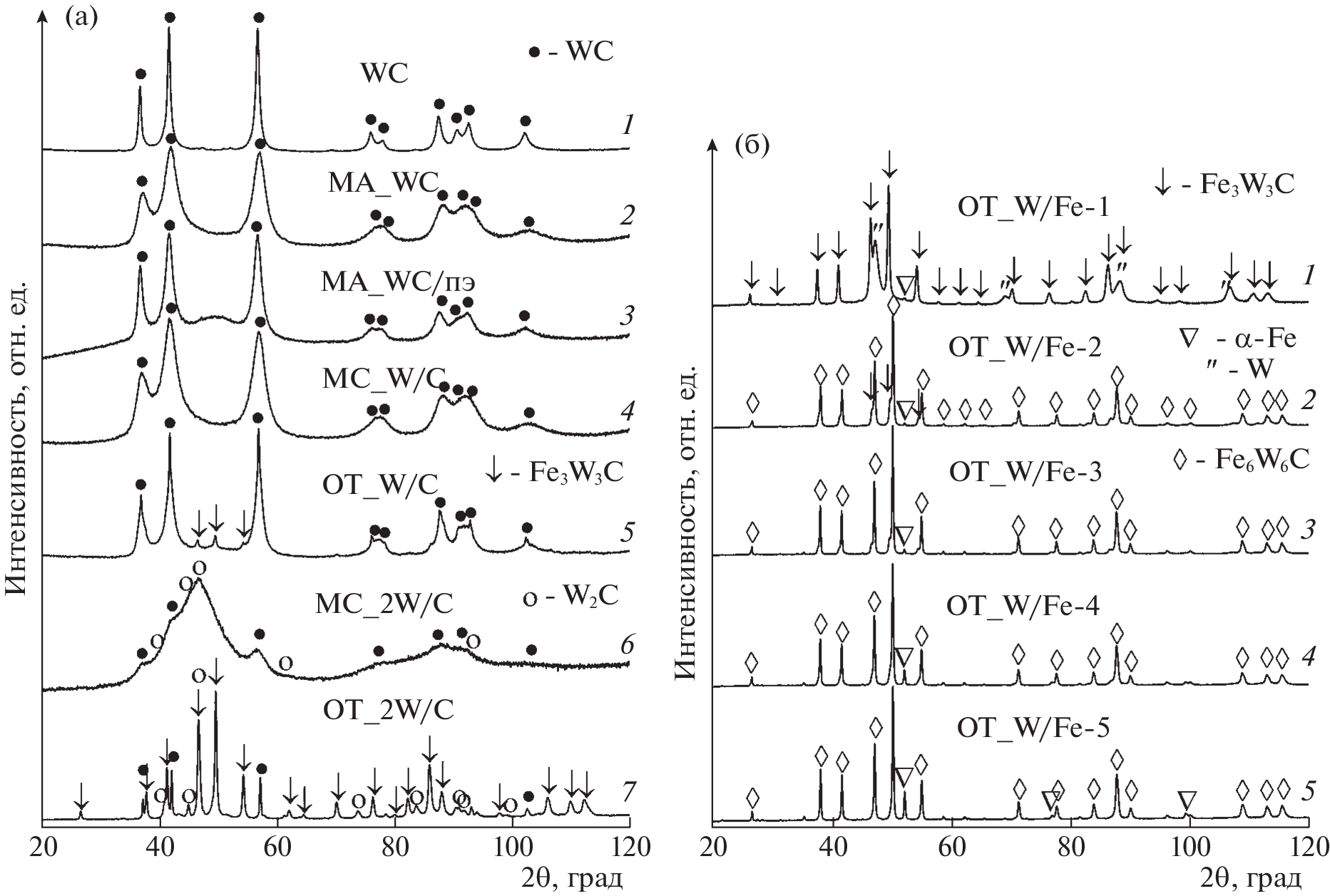 The electrocatalytic activity of a number of mechanically activated/mechanically alloyed carbide phases of iron and tungsten and Fe3W3C and Fe6W6C bimetallic carbides in the evolution of hydrogen has been studied. Electrocatalysts have been prepared by compacting carbide particles with polyaniline as a conducting polymer. The highest activity is exhibited by Fe3C and WC nanocrystalline particles. Metallic phases in the composition of the particles slow down the rate of hydrogen evolution. Subsequent annealing of these particles transforms metallic phases to bimetallic carbides and accelerates the hydrogen evolution. The activity of the phases of Fe3W3C and Fe6W6C bimetallic carbides in the hydrogen evolution is fairly high, but they are inferior to the Fe3C and WC nanocrystalline particles.