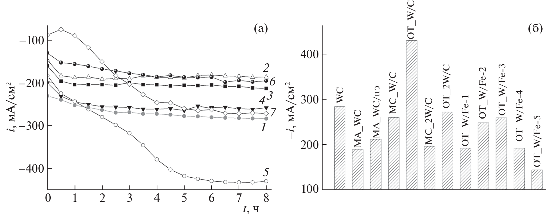 Hydrogen Evolution on Mechanically Synthesized Particles of Tungsten- and Iron-Based Carbides: WC, Fe3C, Fe3W3C, Fe6W6C