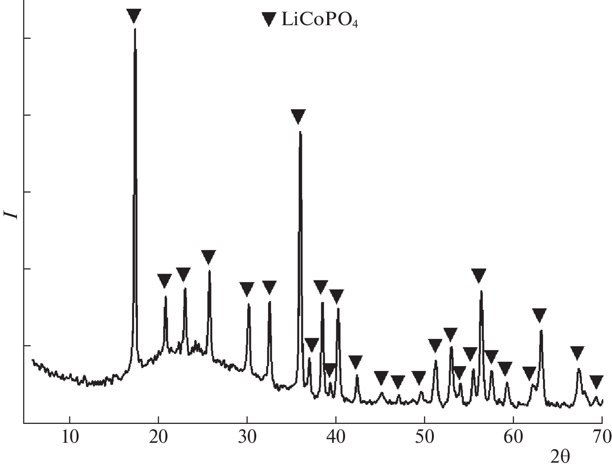 A new and highly efficient way of obtaining finely dispersed LiCoPO4 powder is developed with a given morphology from ammonium substituted precursor NH4CoPO4⋅H2O in a lithium nitrate melt. It is shown that the morphology of the obtained product is determined by the morphology of the used precursor and depends on the physicochemical conditions of its preparation. The obtained LiCoPO4 and its precursors are characterized by means of XRD, SEM, and BET. Electrochemical tests show the resulting powder is electrochemically active. Cathode material based on the obtained LiCoPO4 shows a high specific discharge capacity of 110 mA h/g at a current density corresponding to a charge/discharge rate of 1C, due to the high dispersion and lamellar morphology of the particles of the synthesized powder. The proposed procedure is characterized by the speed of obtaining the target product. It does not require the use of expensive equipment or additional stages of high-temperature crystallization and grinding, and can be scaled up to industrial use.