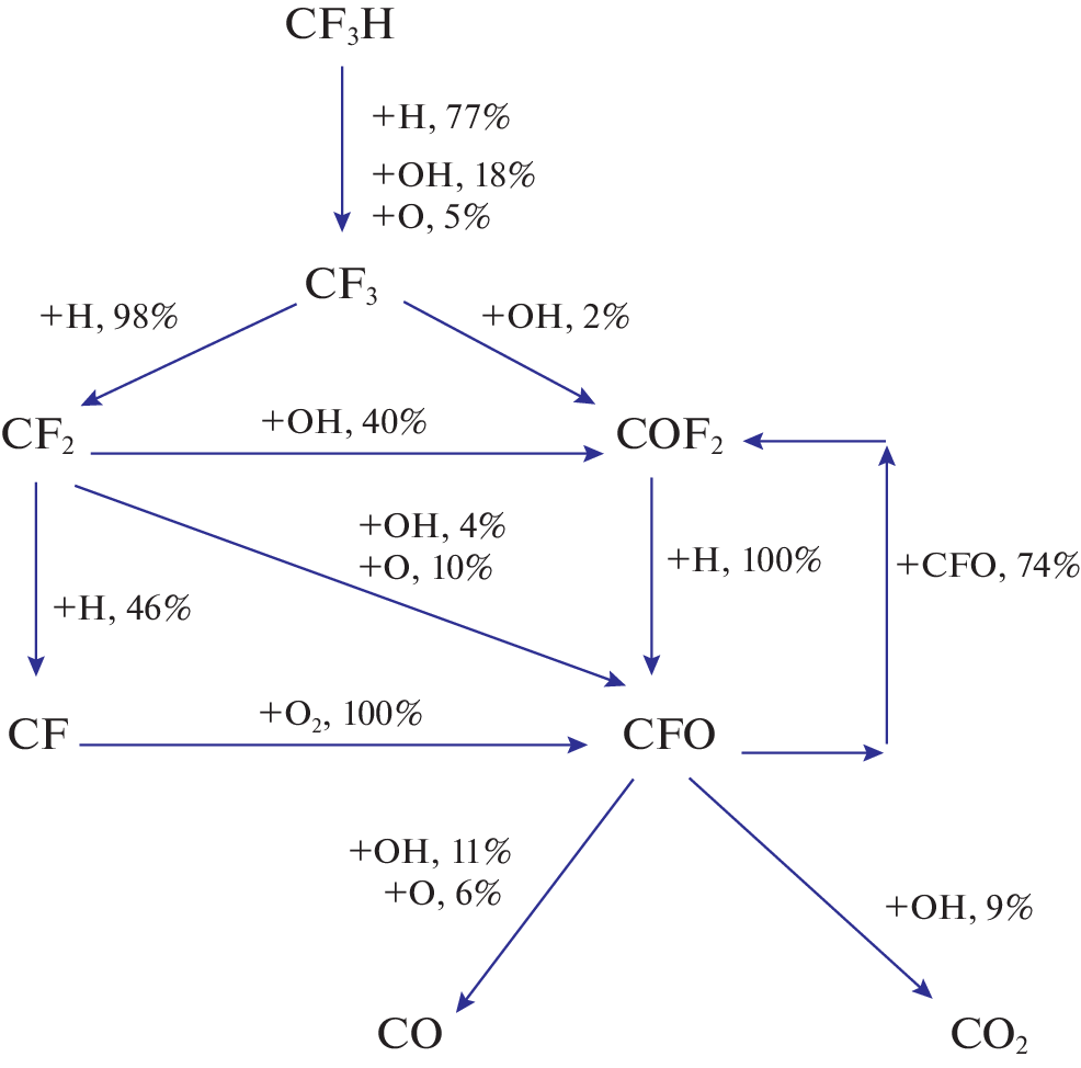 The mechanism of CF3H transformation in the flame of methane–oxygen mixtures of various compositions was calculated from the available experimental data on the concentrations of intermediates, taking into account only those elementary reactions whose kinetic parameters are known. In the flame of a CH4/O2 mixture, CF3H is destroyed in reactions with H, O, and OH without being regenerated, which disproves the classical (and still existing) ideas about the molecular mechanism of the transformation of initial reagents in the flame. In a rich mixture, the transformation mainly proceeds due to the reactions of CF3H, CF3, СF2, and COF2 with atomic hydrogen, competing with the stage of branching of the reaction chains that inhibit the combustion of methane in oxygen. In a stoichiometric and especially in a lean mixture, the role of oxidative processes involving O and OH increases, and the inhibition effect weakens. The resulting scheme qualitatively describes the entire known experimental picture observed during the combustion of CH4/O2/CF3H mixtures.