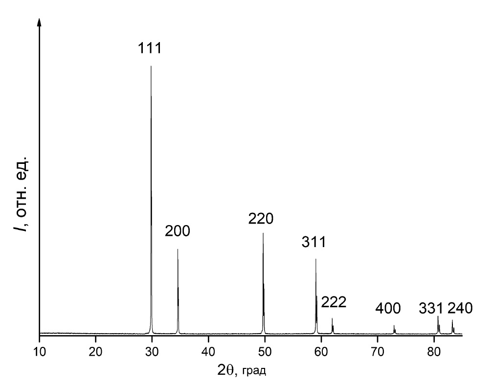 Для измерений синтезирован однофазный образец Er2O3 ∙ 2HfO2 структурного типа дефектного флюорита с параметром ячейки а = 5.185 А (рис. 1). Образец, по результатам EDX, не содержал посторонних примесей и не являлся наноразмерным в соответствии с оценками ширины рефлексов дифрактограммы по Шереру. Микрофотография поверхности приведена на рис. 2. В соответствии с результатами химического анализа образец содержал 50.15 ± 0.05 мол. % 2HfO2.