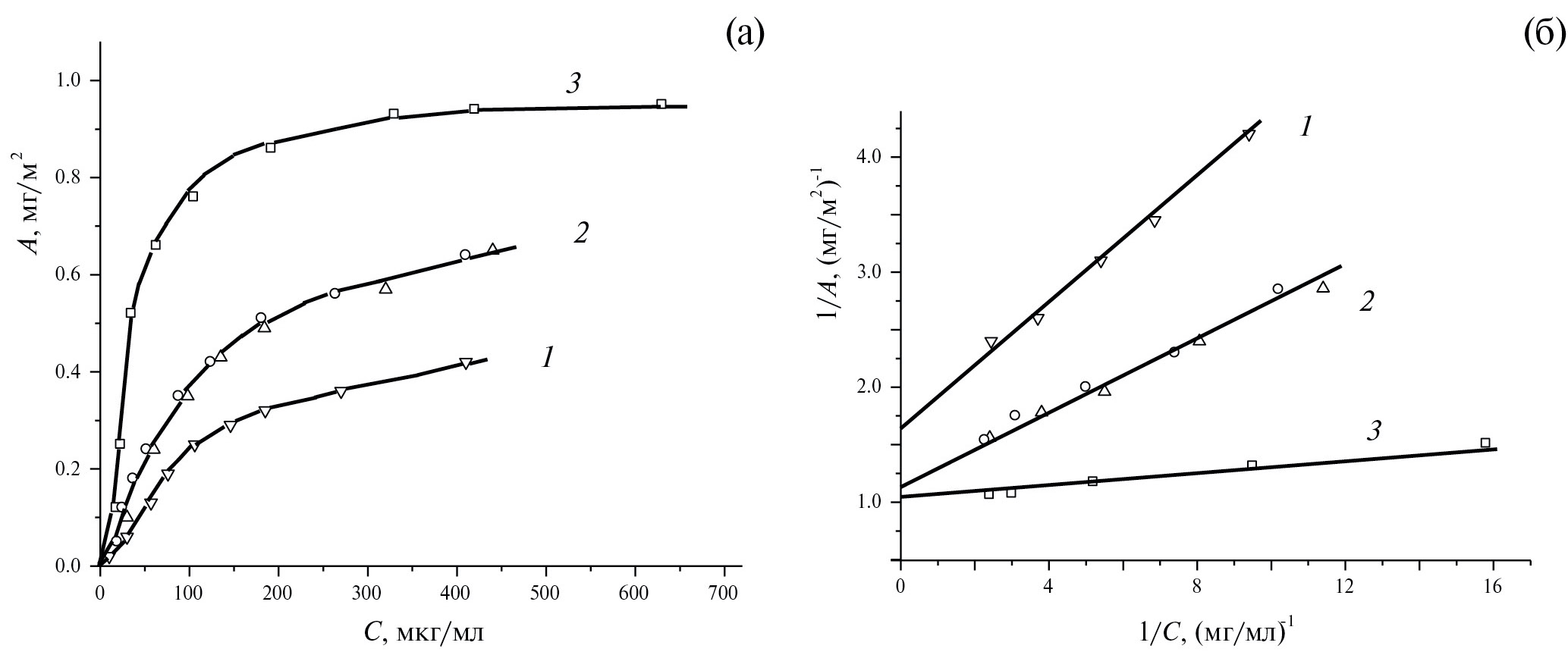 Сравнение результатов, приведённых в табл. 3, показывает, что адсорбция фосфатазы – самого крупного белка – приблизительно в полтора раза меньше, чем адсорбция трёх других белков, если расчёт вести в мг/г (адсорбента) или мг/м2 (поверхности). Если же предельную адсорбцию рассчитать в моль/м2, то прослеживается тенденция: чем больше молекулярная масса белка, тем меньше его молекул размещается на поверхности. Молекулярные массы лизоцима и щелочной фосфатазы различаются практически на порядок, и величина адсорбции лизоцима (в моль/м2) больше адсорбции фосфатазы в 16.5 раз на рассмотренном образце.