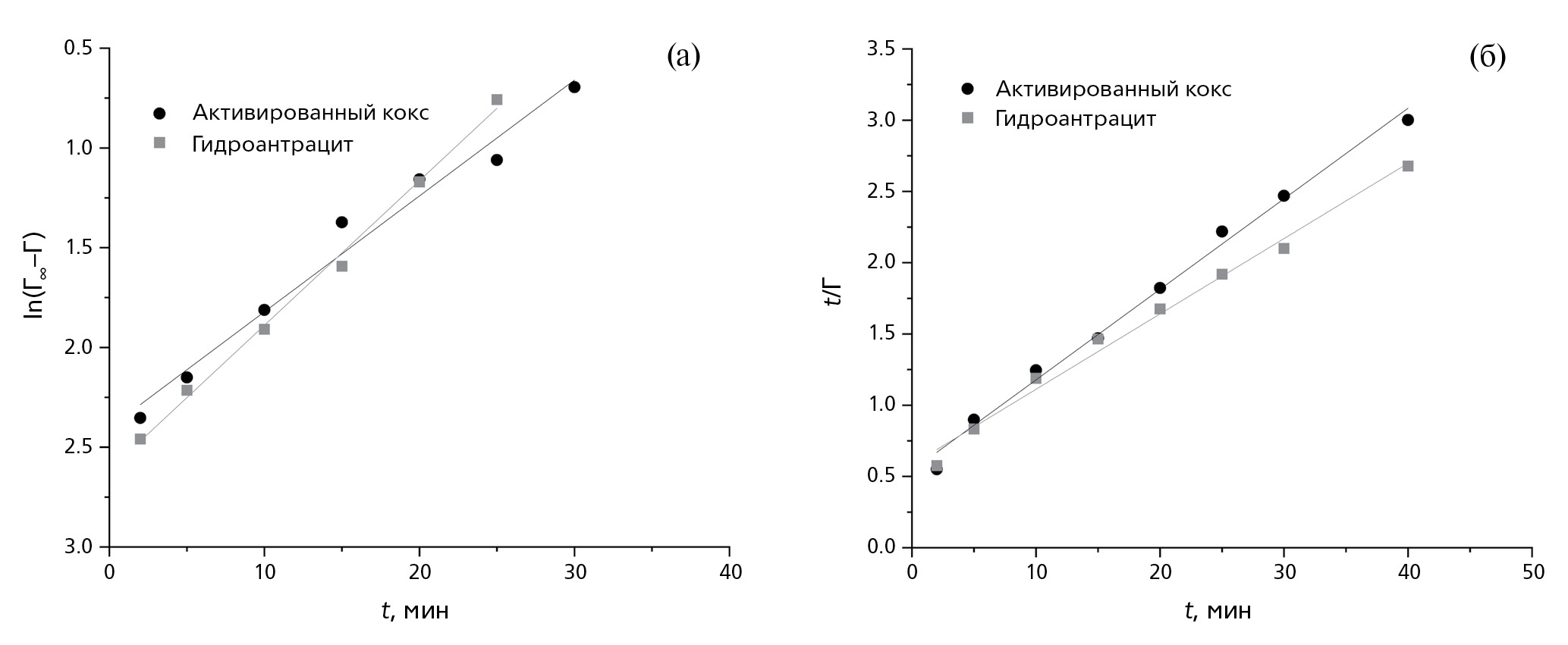 Рис. 6. Модели псевдо-первого и псевдо-второго порядков для активированного кокса (а) и гидроантрацита (б).