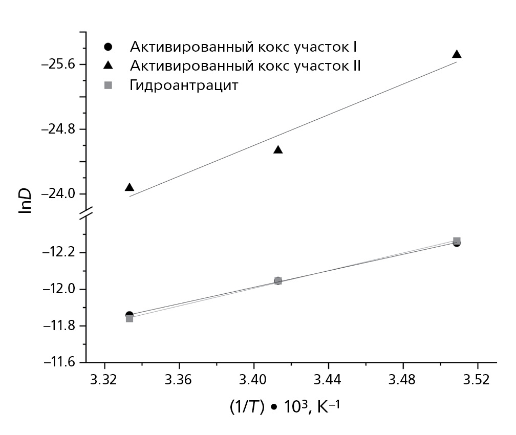 Активированный кокс, участок I | 285 | 4.77×10‒6 | lnD = ‒2.25/T ‒ 4.37 | 0.999 | 18.68±3.25 |