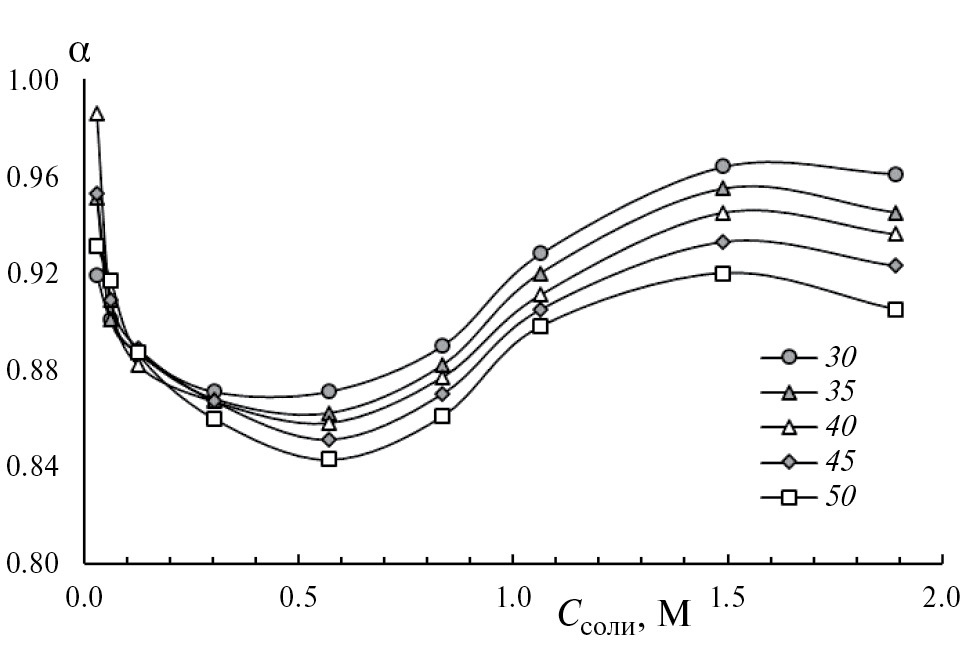 Расчетные значения степени диссоциации с ростом концентрации соли первоначально снижаются, затем при достижении концентрации 0.6 М (мольное отношение соль : сульфолан ≈ 16) начинают возрастать, достигая максимума при концентрации примерно 1.5 М (мольное отношение соль : сульфолан ≈ 6) (рис. 3).