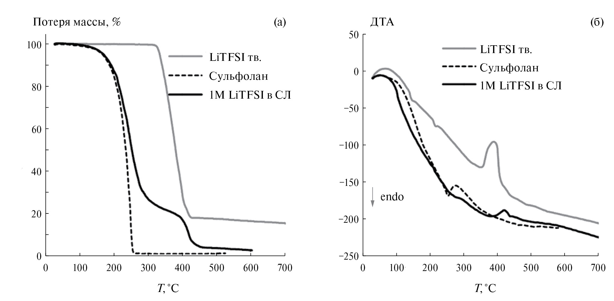 Бис-(трифторметансульфонил)имид лития обладает высокой термической устойчивостью, его термодеструкция начинается при температуре более 320 °С, осуществляется в одну стадию и сопровождается сильным экзотермическим эффектом (рис. 5). Сульфолан является высококипящей жидкостью и в условиях термогравиметрического анализа испаряется, не подвергаясь термохимической деструкции. При нагреве 1 М сульфоланового раствора LiN(SO2CF3)2 первоначально происходит испарение сульфолана и лишь затем термодеструкция соли. Следует отметить, что температура испарения сульфолана из солевого раствора выше, чем чистого сульфолана, и разница между температурами испарения индивидуального сульфолана и сульфолана из раствора увеличивается по мере увеличения концентрации соли. Судя по форме кривых ДТА, какого-либо химического взаимодействия между сульфоланом и анионом соли при нагреве не происходит.