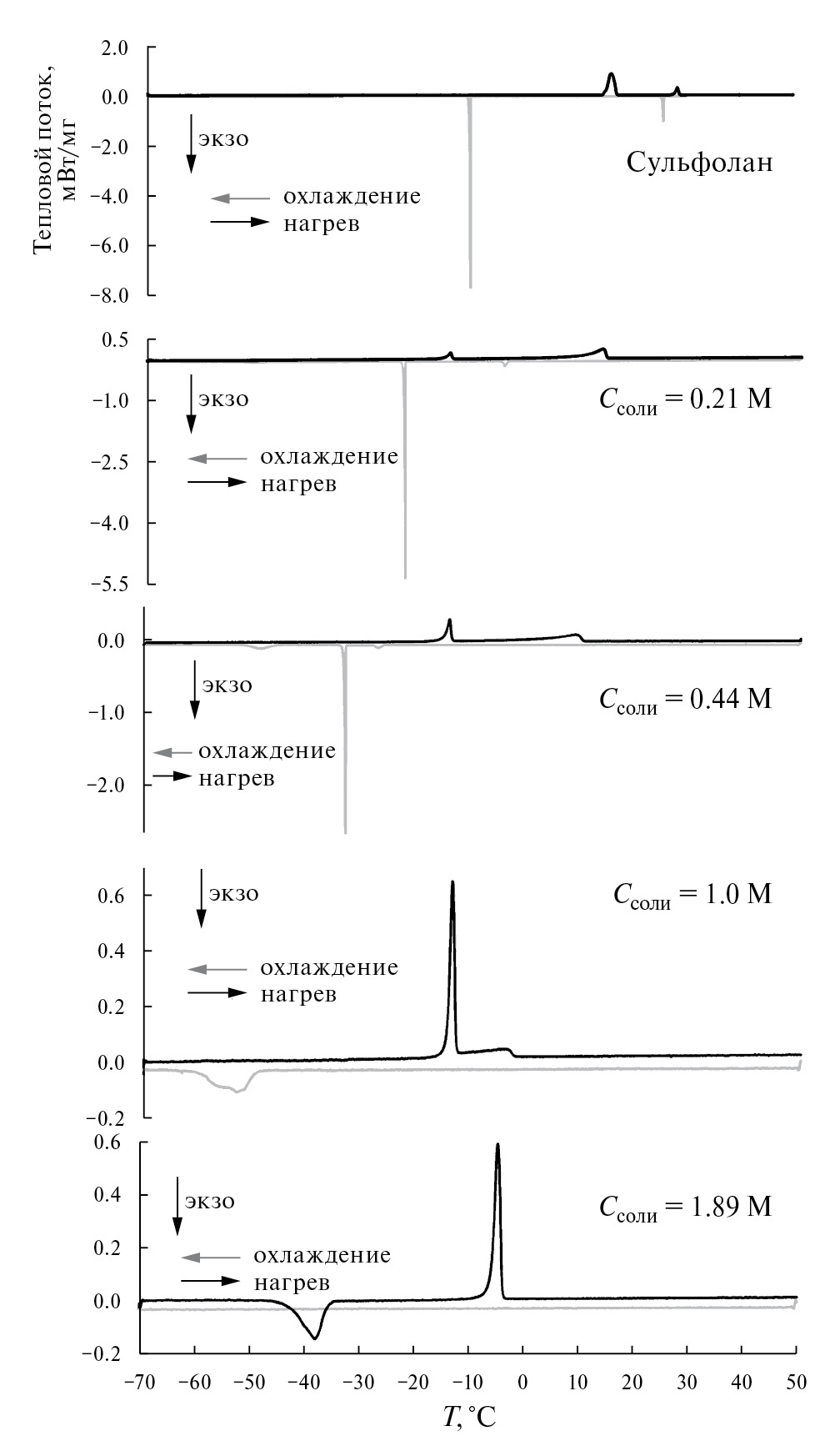 При нормальных условиях сульфолан находится в кристаллическом состоянии. На кривой нагрева сульфолана (рис. 6) наблюдаются два эндотермических эффекта, соответствующих переходу из кристаллической фазы в мезоморфную (14.8 °С) и плавлению мезоморфной фазы (27.7 °С) [34, 37–39]. На кривых охлаждения сульфолана также наблюдаются два тепловых эффекта, однако их температуры существенно отличаются от температур тепловых эффектов на кривых нагрева. Первый экзотермический эффект на кривых охлаждения наблюдается при температуре 25 °С, а второй – при температуре –10 °С. Вероятно, первый экзотермический эффект соответствует переходу сульфолана из жидкого состояния в мезоморфную фазу, а второй – из мезоморфной фазы в кристаллическую. Существенные различия в температурах фазовых переходов при нагреве и охлаждении сульфолана указывают на его склонность к образованию переохлажденных состояний.