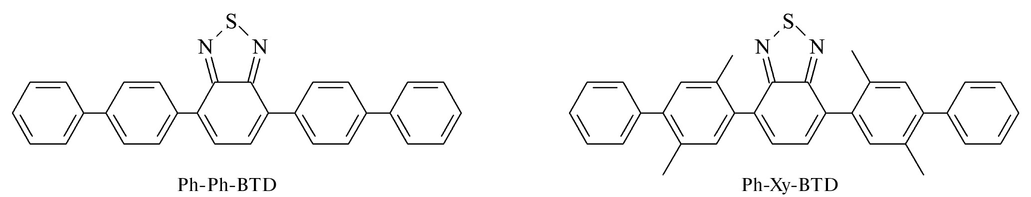 Настоящая работа посвящена сравнительному исследованию электронных спектров, термических характеристик и растворимости 4,7-ди([пара-бифенил]-4-ил)бензотиадиазола (Ph-Ph-BTD) и его нового производного с боковыми метильными группами – 4,7-бис(2,5-диметил-[1,1’-бифенил]-4-ил)бензотиадиазола (Ph-Xy-BTD) (рис. 1).