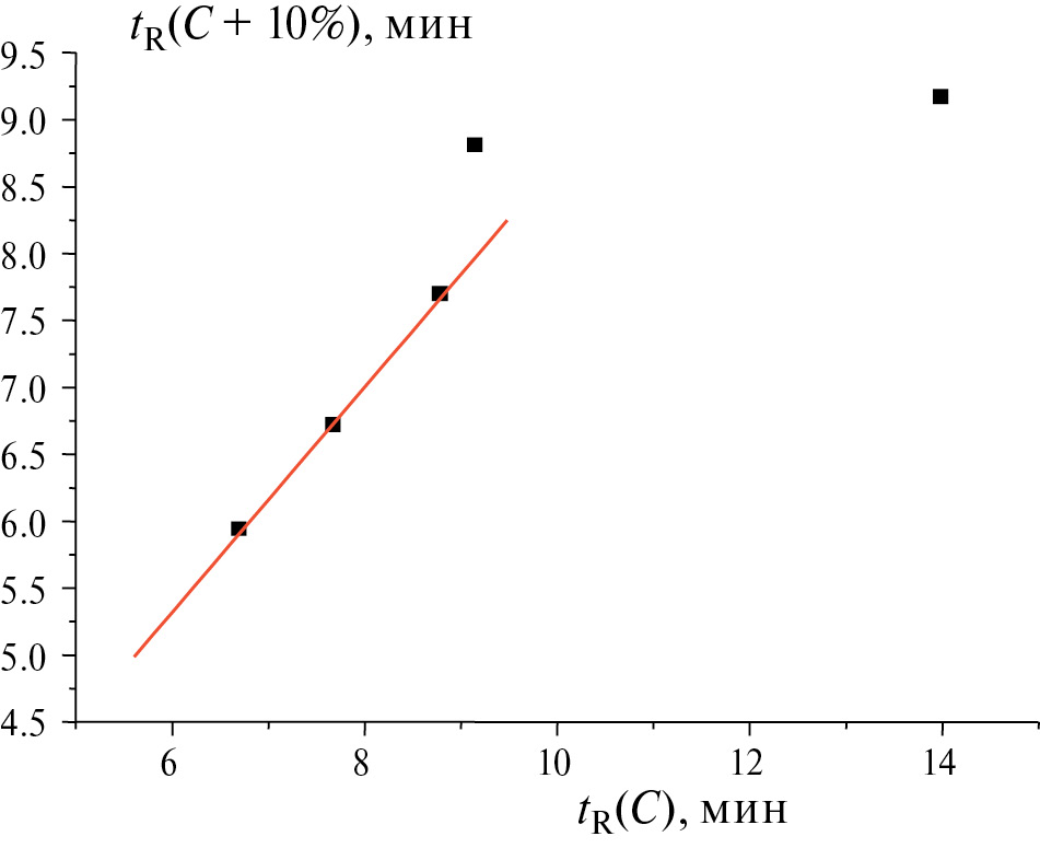 И, наконец, для оксимов 4-метилбензальдегида и 4-гидроксибензальдегида зарегистрированы не встречавшиеся ранее аномалии рекуррентной аппроксимации времен удерживания. Точки tR(30)–tR(40), соответствующие наибольшему содержанию воды в элюенте, отклоняются не вниз, а вверх от линий регрессии. Рисунок 3 иллюстрирует такую аномалию на примере оксима 4-метилбензальдегида.