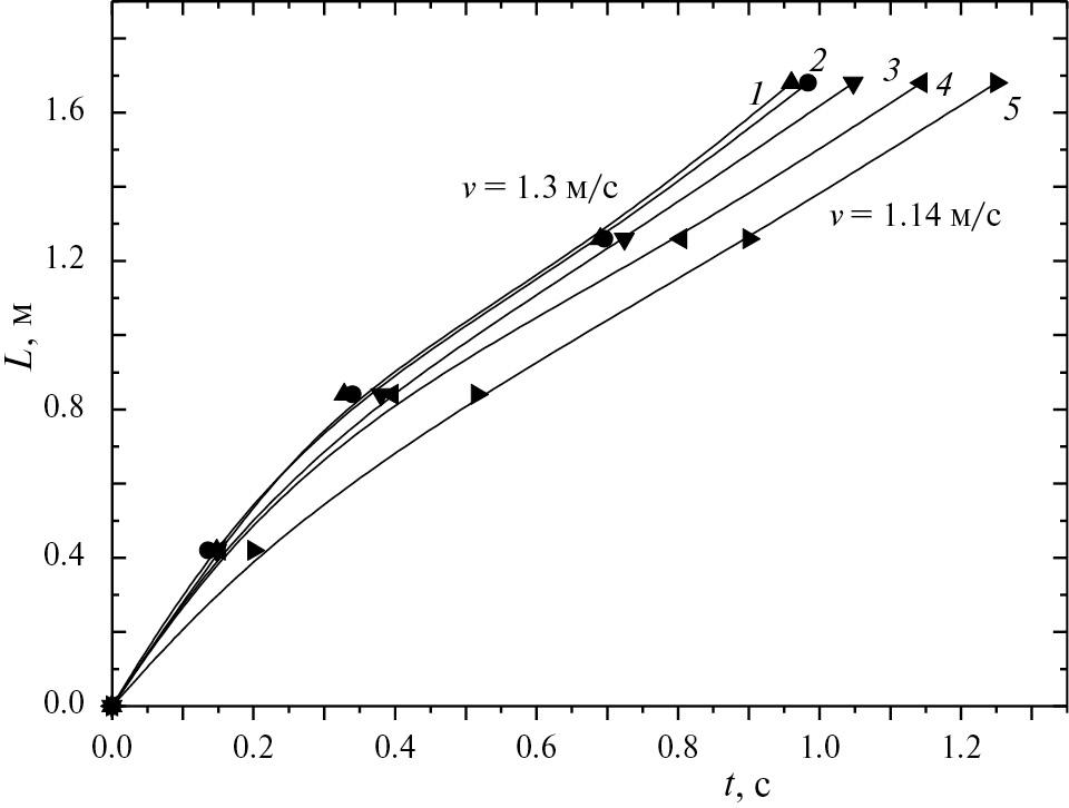 Рис. 5. х – t-диаграмма горения метано-воздушной смеси c 5.5% СH4 + 94.5% воздух; кривые 1, 2 – 5.5% CH4 + 94.5% воздух + уголь, кривые 3, 4, 5 – без угля.
