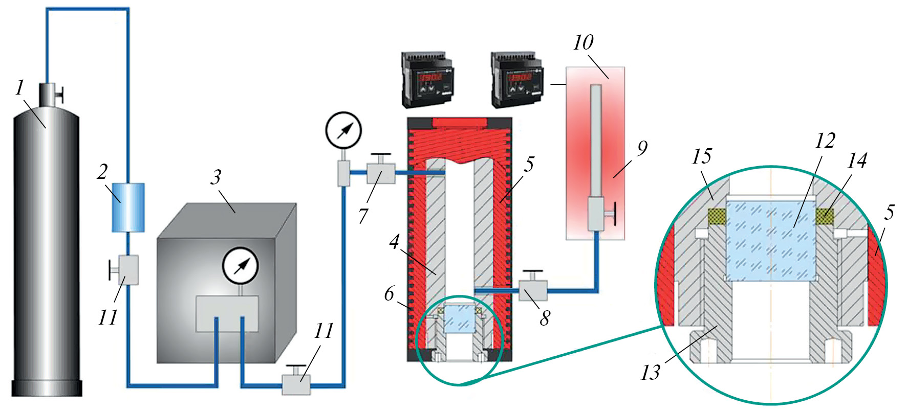 Рис. 1. Схема экспериментальной установки для исследования фазового равновесия бинарных систем с использованием оптической ячейки высокого давления: 1 – баллон, 2 – фильтр-осушитель, 3 – насос, 4 – оптическая ячейка высокого давления, 5 – медная рубашка, 6 – термоизоляция, 7 – вентиль для отбора верхней (газовой) фазы, 8 – вентиль для отбора нижней (жидкой) фазы, 9 – пробоотборник, 10 – термостатирующая ванна, 11 – вентиль, 12 – сапфировое окно, 13 – крышка ячейки, 14 – кольцо уплотнительное (резиновое с полиимидным покрытием), 15 – корпус ячейки