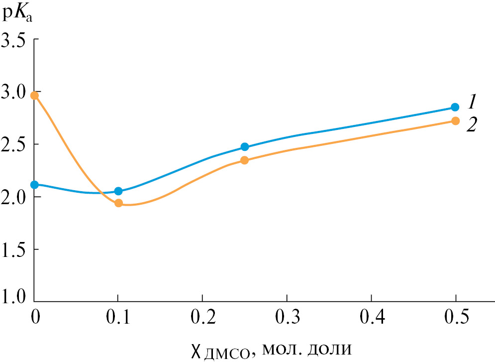 В смешанном растворителе, содержащем от 0.0 до 0.1 мол. доли ДМСО, наблюдается возрастание основных свойств 2-меркаптоимидазола. Значения рКа 1МИ в воде и в растворителе состава 0.1 мол. доли. ДМСО различаются в пределах экспериментальной погрешности (табл. 2). Дальнейшее увеличение содержания ДМСО в растворителе приводит к плавному уменьшению основных свойств обоих лигандов (рис. 1).