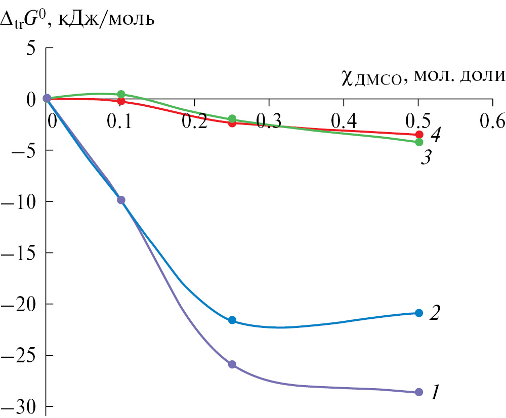 Рис. 2. Изменение энергии Гиббса протонированной формы 1-метил-2-меркаптоимидазола (∆trG0H1МИ+,1), протона (∆trG0H+, 2), реакции протонирования 1-метил-2-меркаптоимидазола (∆trG0r, 3) и 1-метил-2-меркаптоимидазола (∆trG01МИ, 4) при переносе из воды в растворители Н2О–ДМСО