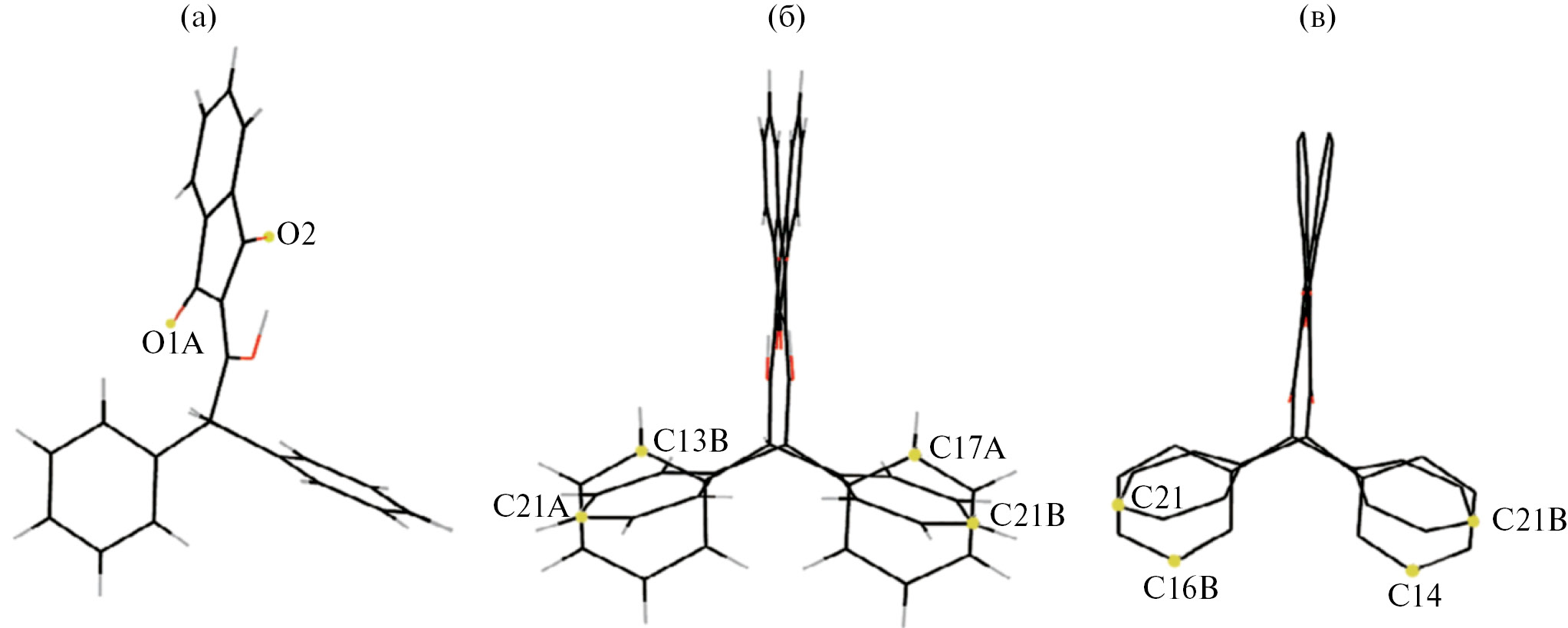 Хорошей моделью для иллюстрации данного вывода и демонстрации стереоизомеров на основе исследованной молекулы является полиморф II. В ячейке модификации II содержатся три независимые молекулы (N, N_A, N_B). Молекулы N и N_A пространственно полностью совпадают (рис. 2а), в то время как их стереоизомер (N_B) при наложении показывает различие в расположении фенильных колец (рис. 2б, в). Фрагменты молекул N_A и N_B (соответственно N и N_B) при наложении (с минимизацией среднеквадратичных отклонений соответствующих атомов) не совпадают.
