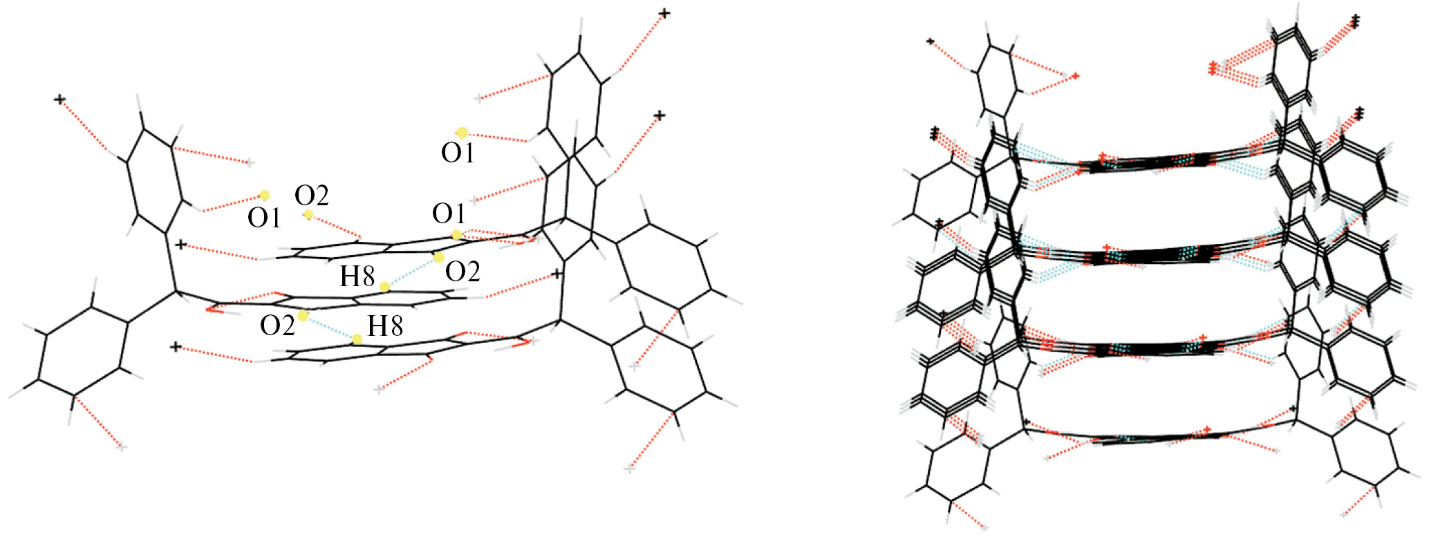 Оптимально было бы попытаться «решить» разом задачу образования полиморфов исключительно за счет реализации «кето» или «енольной» форм, хотя именно реализация ВМВС с образованием одного из таутомеров будет самым выигрышным (энергетический фактор) [33]. Сложно представить реализацию межмолекулярных водородных связей (ММВС) для стерически затрудненных молекул, к которым следует отнести ДФ. Другими претендентами на стабилизацию конформации в полиморфе могут служить кооперативные эффекты за счет реализации по отдельности или в различных комбинациях, стэкинг С–Н…π-взаимодействий всех типов [34] и коротких С–Н…О-контактов [33]. Поскольку подтвержденное экспериментально для ДФ отсутствие разнообразия во ВМВС и ММВС накладывается на отсутствие переноса заряда за счет образования комплекса, то, скорее всего, именно комбинация слабых ненаправленных взаимодействий D–H…A в конечном итоге привела к реализации различных упаковочных мотивов в изученных полиморфных формах.