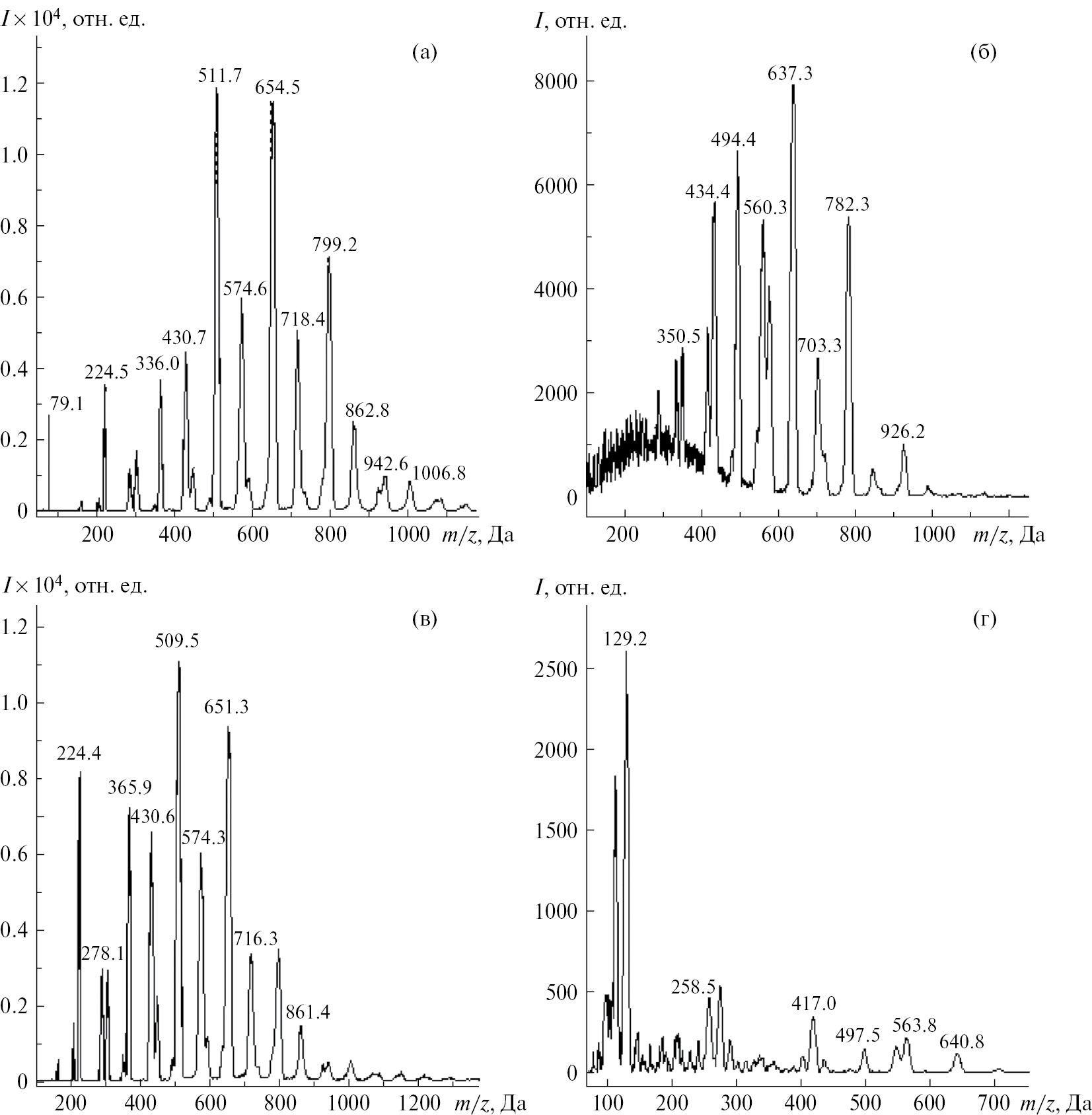 Масс-спектры получали в широком диапазоне масс до 7000 Да, однако на рисунках ниже показаны только информативные части спектров.
