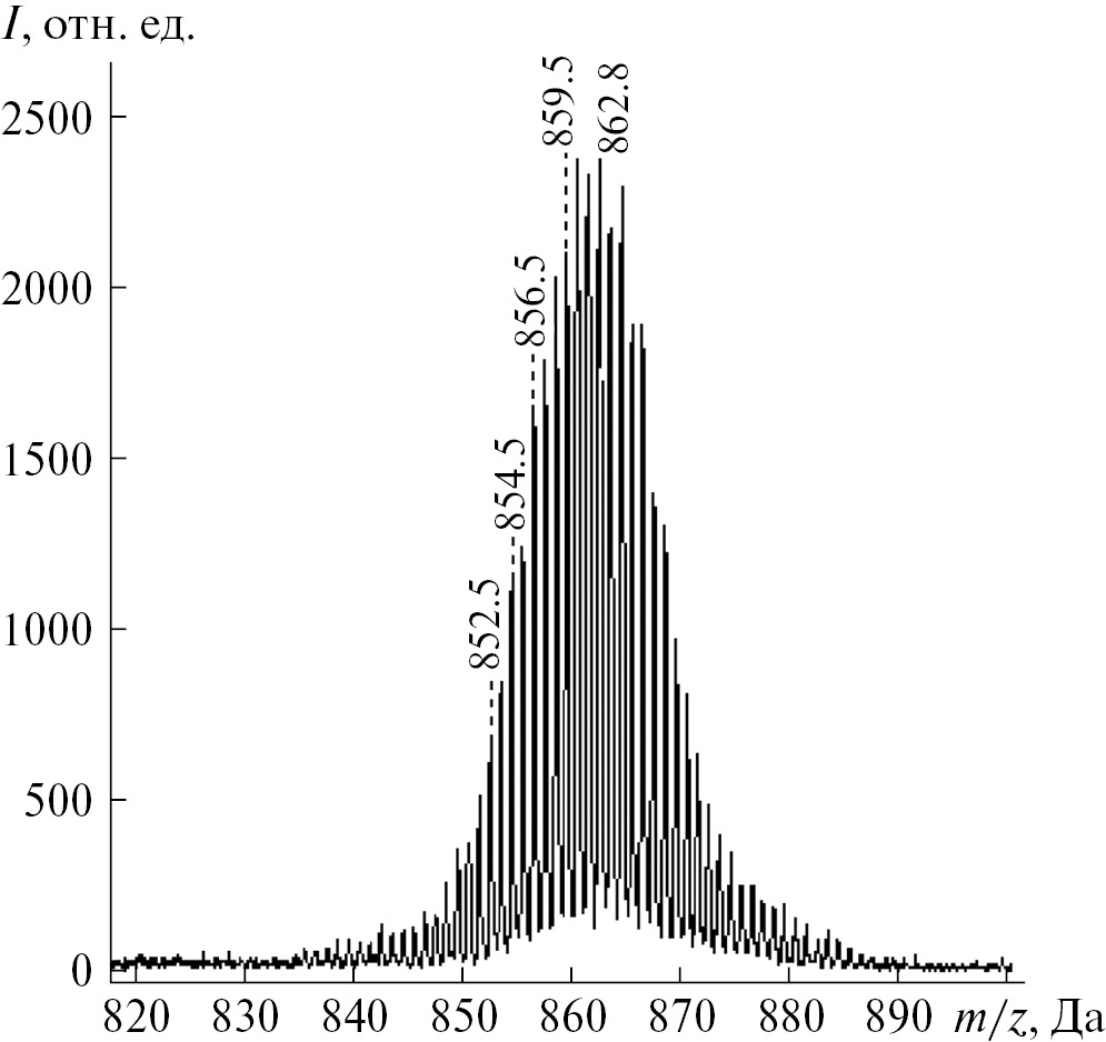 Согласно рис. 1, масс-спектры исходной ФМК характеризуются большим набором регистрируемых пиков. Поскольку молибден состоит примерно из семи изотопов, регистрируемые пики имеют широкий диапазон, каждый около 30–40 Да. На рис. 2 показан типичный пик с максимальным значением m/z = 862.8 Да. По этой причине в табл. 1 и 2 результаты представлены в виде диапазона зафиксированного пика и соответствующего максимального значения m/z.