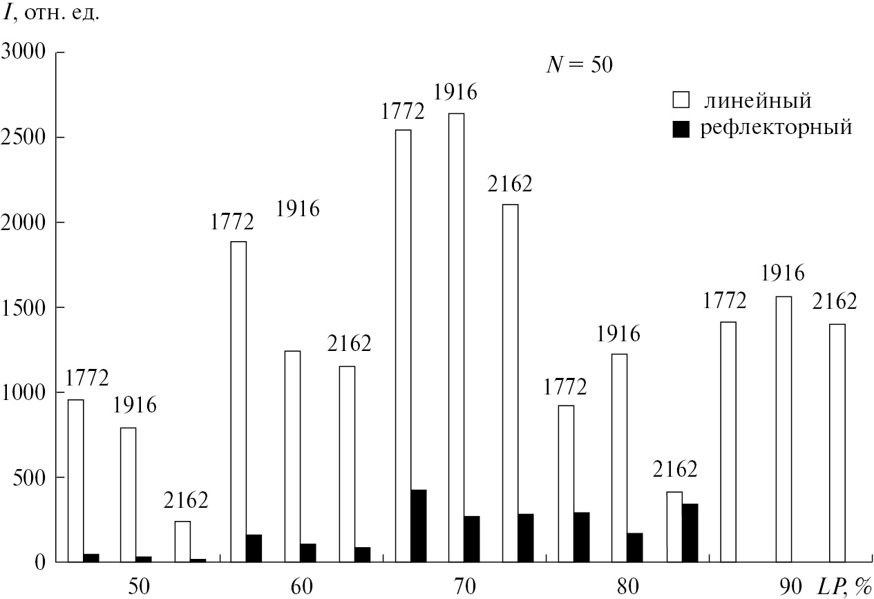 Согласно полученным данным, для линейного метода пиковая интенсивность неоднозначно зависит от энергии лазера LP и количества выстрелов Nshot. В общем случае пиковые значения интенсивности и LP, а также Nshot находятся в симбатной зависимости. Интенсивность пика больше зависит от энергии лазера, чем от количества выстрелов.