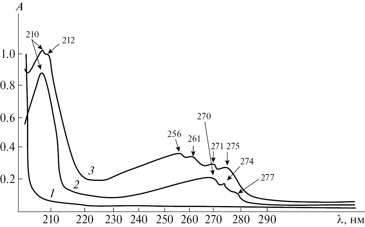 Рис. 1. Электронные спектры поглощения водных растворов ПК (1), Tyr (2), смеси ПК и Tyr (3); C ПК = 1.0×104 моль/л, СTyr = 1.0×10–4 моль/л, рН 7.0, l = 1.0 см, 25 °С
