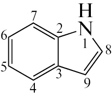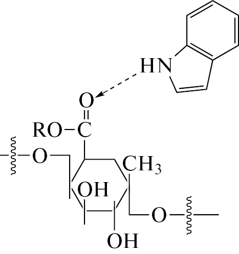 Методом мольных отношений определены состав, константы устойчивости и термодинамические характеристики комплексов (табл. 2). Согласно данным метода мольных отношений, ПК образует с МА комплексы состава 1:1 (рис. 3). Из данных табл. 2 видно, что в зависимости от температуры процесса устойчивость системы ПК-Trp выше примерно в 1.5–3 раза по сравнению с комплексом ПК-Ind, что может свидетельствовать об основополагающем вкладе индольного фрагмента триптофана в данный параметр. Дополнительная стабилизация комплекса ПК-Trp достигается за счет образования водородных связей посредством карбоксильной группы Trp с гидрокси-функциями ПК [21] согласно следующей структуре: