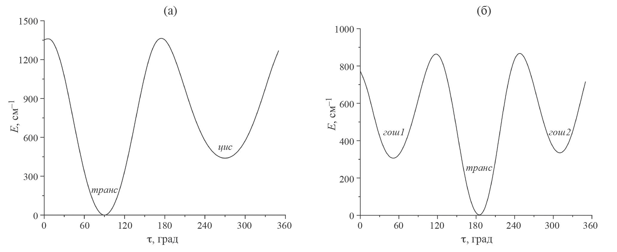 После построения сечений ППЭ для системы опорных точек функции F, B и V аппроксимировали гармоническими функциями. Полученные выражения подставляли в приведенные выше гамильтонианы, уравнения Шрёдингера решали вариационным методом в мультипликативных базисах тригонометрических функций с помощью программ Torsio [12], Vib2D [13] и Vib3D, разработанных А. В. Абраменковым.