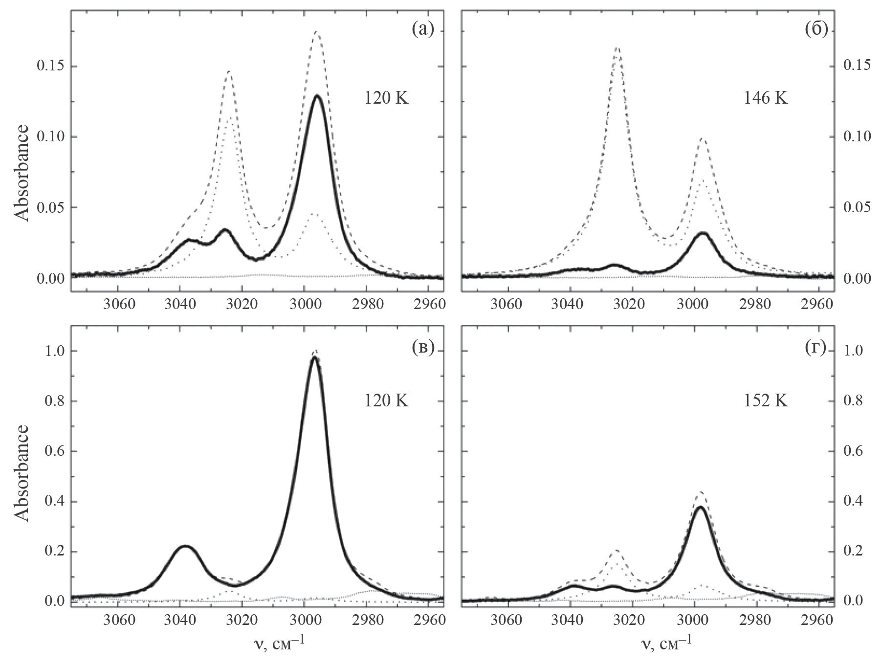 Рис. 2. ИК-спектры смесей энфлюрана и ДМЭ в сжиженном криптоне; a, б – энфлюран ~ 5 ×10–5 мол.доли, ДМЭ ~ 5 ×10–5 мол.доли; в, г – энфлюран ~ 5 ×10–5 мол.доли, ДМЭ ~ 5 ×10–4 мол.доли. Штриховая линия – смесь, пунктирные линии – мономеры (энфлюран, ДМЭ – короткий пунктир), сплошная толстая линия – комплекс