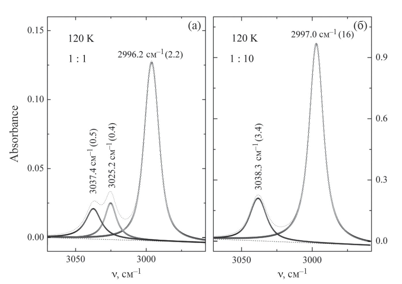 Рисунок 3 отображает результат фитирования полос комплексов для разных концентраций ДМЭ при 120 К, позволяющий оценить как относительную интенсивность высокочастотной и низкочастотной компонент, так и частоту максимума этих полос. Результаты приведены на рис. 3.