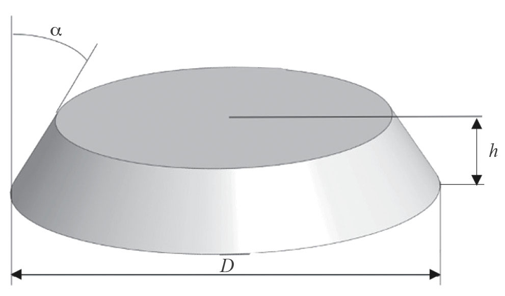 Рис. 1. Золотая наночастица с формой усеченного конуса, диаметром основания D, высотой h и углом наклона боковой грани α