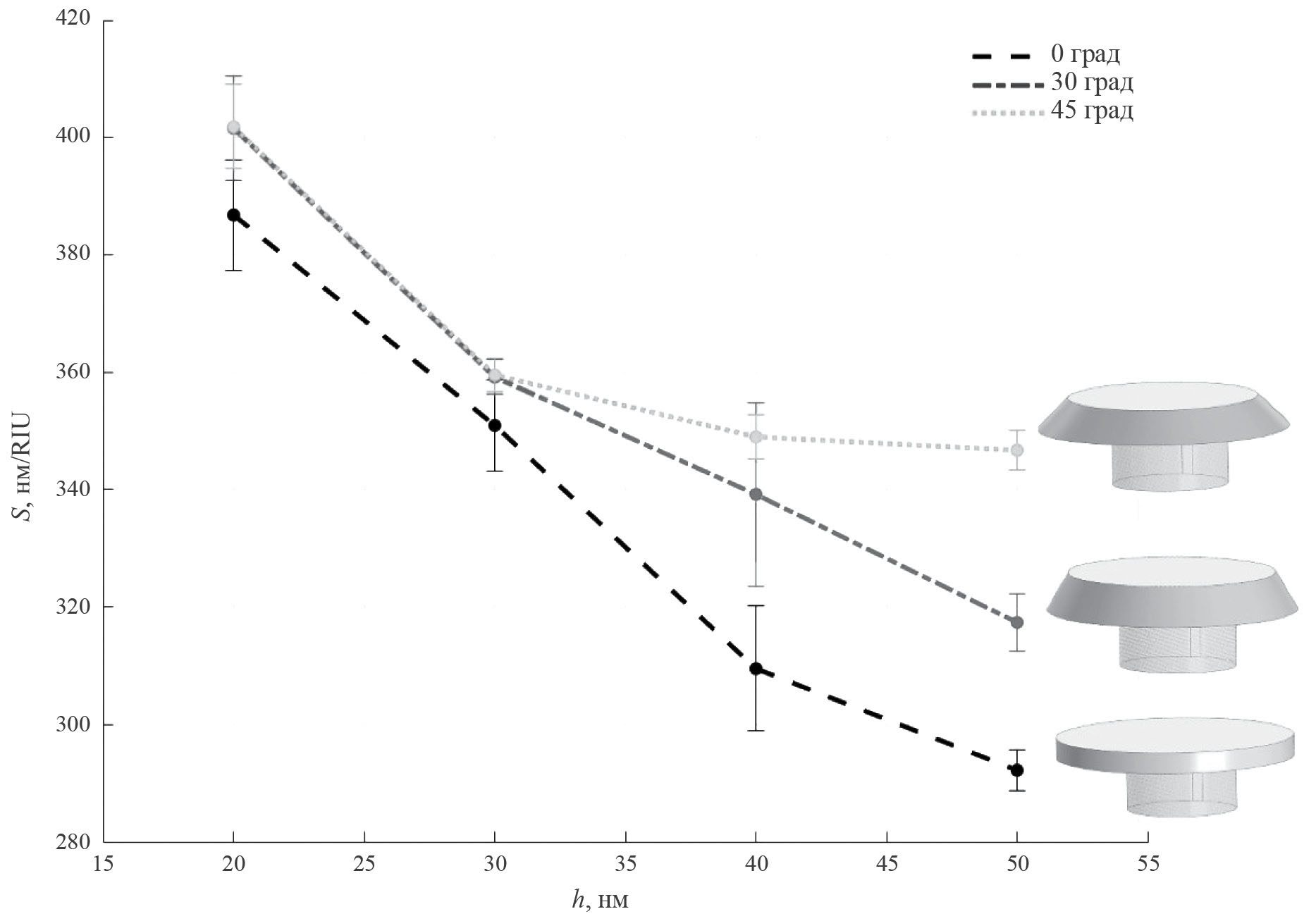 Из приведенных данных видно, что при уменьшении угла наклона боковой грани чувствительность увеличивается. Таким образом, наиболее чувствительной структурой данного типа является нанодиск с вертикальными боковыми стенками. Данный эффект можно объяснить локализацией электрического поля при возбуждении плазмонного резонанса вблизи более острых углов, находящихся в контакте с подложкой. При этом область с высокой напряженностью электрического поля оказывается в объеме подложки, что делает её недоступной для молекул аналита, и снижает чувствительность. Для устранения этого влияния на чувствительность была предложена структура, в которой наночастицу помещали на диэлектрический постамент диаметром 40 нм и высотой 30 нм (рис. 6 б). В ходе данного моделирования удалось достичь практически двукратного увеличения чувствительности, при этом наибольшей чувствительностью обладает усеченный наноконус с углом наклона боковой грани 45° (рис. 7).