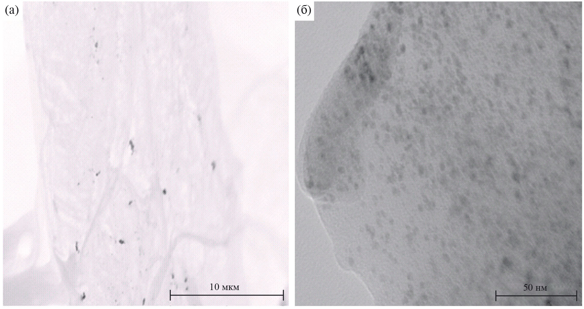 Дифрактограммы полученных образцов Cu2O@NFC (рис. 2) подтверждают образование наночастиц оксида меди (I) и сохранение структуры наноцеллюлозы. По данным СЭМ (рис. 6а) видно сохранение структуры волокон наноцеллюлозы и внедренные округлые агломераты размером 150–800 нм, но из снимков ПЭМ (рис. 6б) следует, что они состоят из округлых наночастиц c распределением размеров в диаметре от 4 до 15.5 нм (рис. 7).