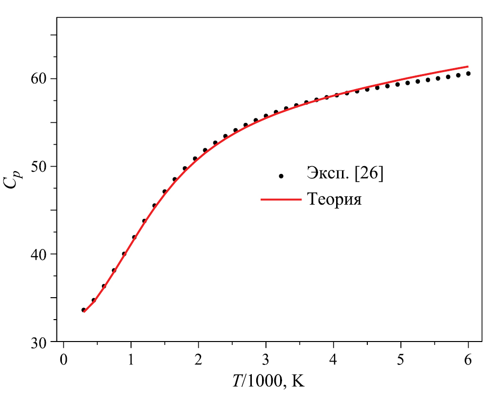 Среди всех термодинамических функций теплоемкость наиболее чувствительна к вводимым в расчет приближениям, главным образом, из-за ее связи со второй производной статистической суммы по температуре. Имея в наличие статистическую сумму из (32), мы рассчитали теплоемкость воды. Результаты представлены на рис. 3. Видно отличное согласие с экспериментальными данными [26]. Незначительное расхождение наблюдается вблизи 6000 К, которое не превышает 1.3%. С дальнейшим ростом температуры теплоемкость достигает максимума около 8500 К и далее убывает, стремясь к постоянному пределу. Эффект связан с конечностью колебательно-вращательного резервуара энергий. Следует отметить полезность аналитических формул для расчета теплоемкости. Для сравнения мы рассчитали несколько температурных точек на кривой зависимости Cp(T) от T, используя формулы суммирования (9) и (10). По сравнению с прямым суммированием аналитические формулы экономят компьютерное время на два порядка и более.