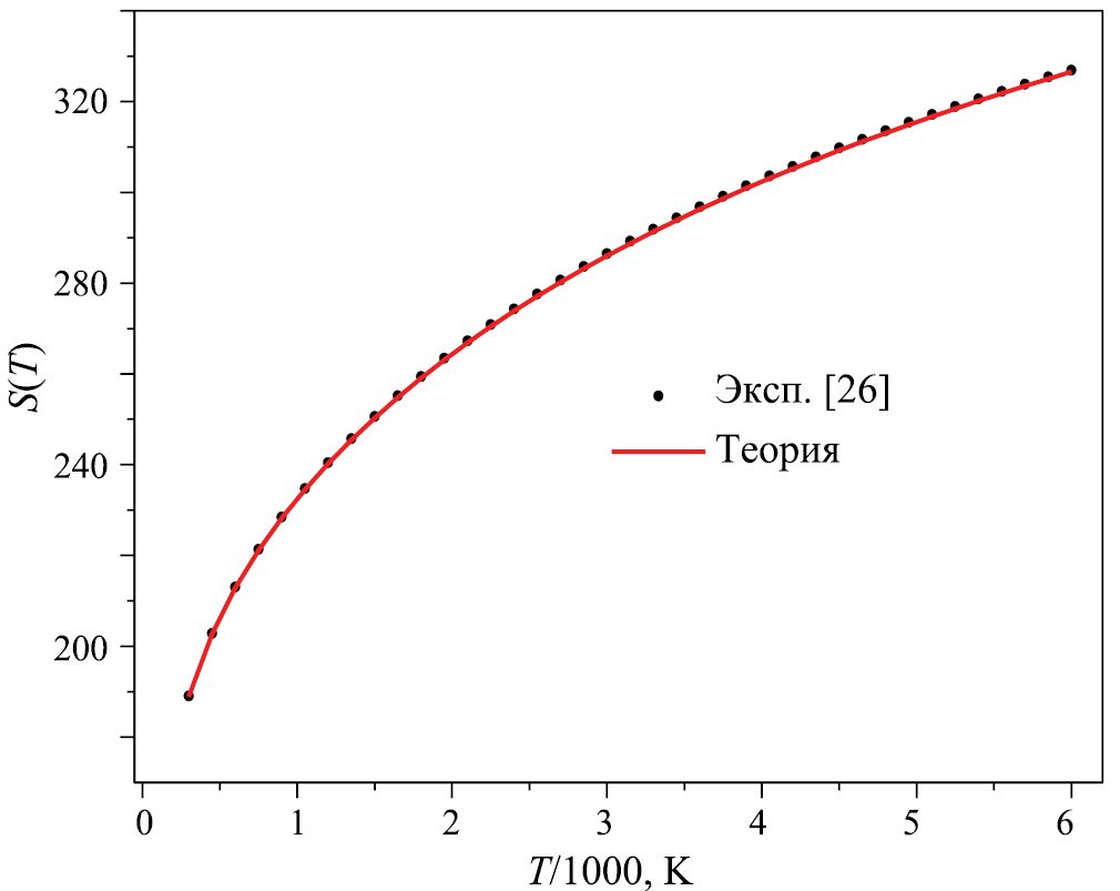 Рис. 4. Сравнение рассчитанных величин с экспериментальными данными [26] на графике молярной энтропии (Дж/(моль К)) от температуры.