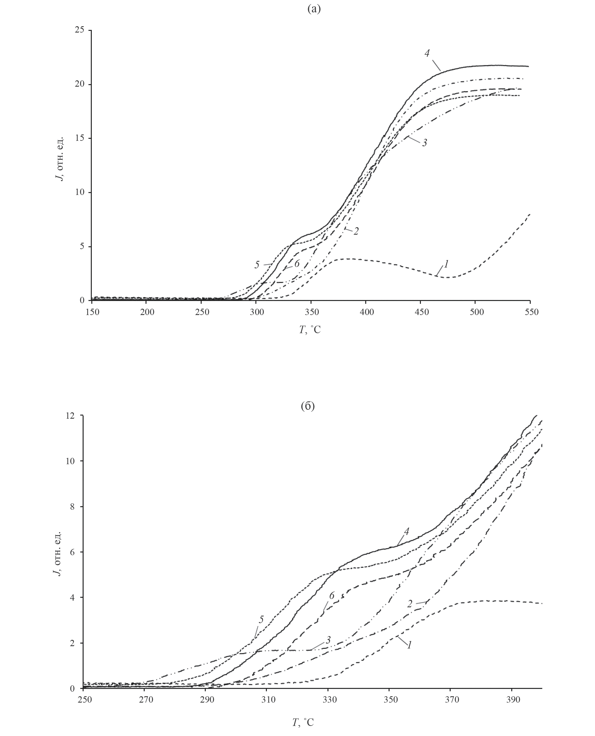 Рис. 1. Зависимости намагниченности J от температуры Т при восстановлении катализаторов в водороде (а) и начальный участок этих зависимостей (б) для: Fe/S (1), (Fe+1.5Sm)/S (2), 0.15Sm/Fe/S (3), Fe/0.15Sm/S (4), (Fe+0.15Sm)/S (5) и 0.15Sm/(Fe+0.15Sm)/S (6).