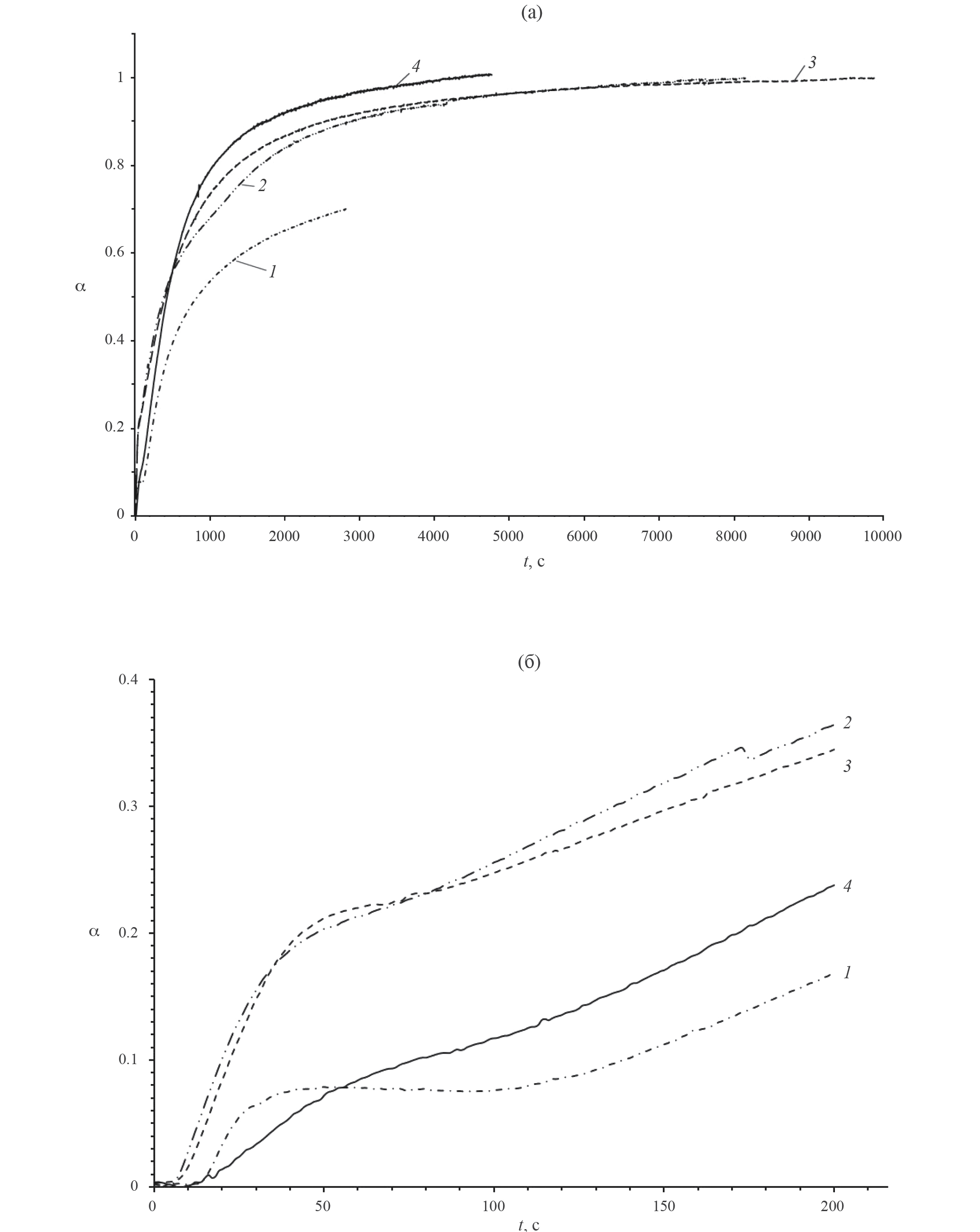 Рис. 2. Зависимости изменения степени превращения α от времени t (а) и начальный участок этих зависимостей (б) для: 0.15Sm/Fe/S (1), Fe/0.15Sm/S (2), (Fe+0.15Sm)/S (3), (Fe+1.5Sm)/S (4).