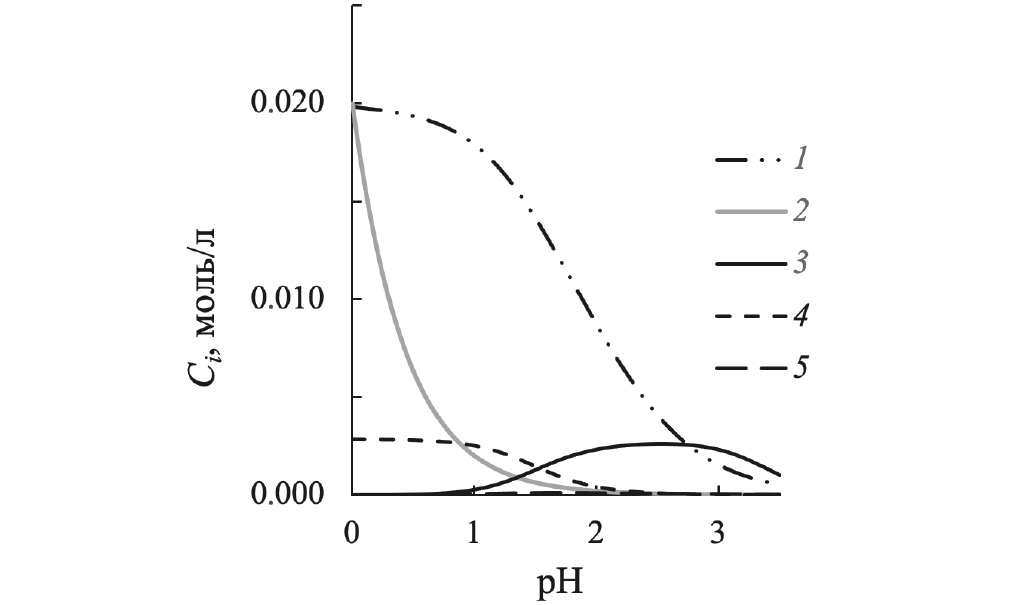 Рис. 2. Зависимости концентрации индивидуальных компонентов (Ci) от рН водных растворов, содержащих 0.02 моль/л никотиновой кислоты и 0.0029 моль/л FeCl3: 1 – C[H2L], 2 – CH+, 3 – C[FeL], 4 – CFe3+, 5 – C[Fe(OH)]2+.