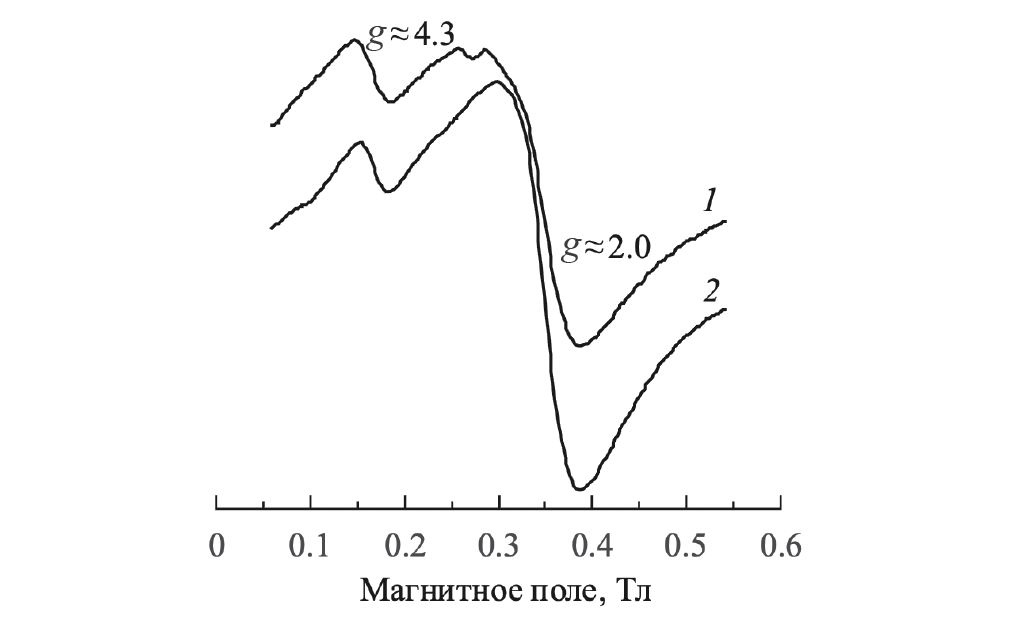 Рис. 3. ЭПР-спектры: 1 – сульфокатионита Dowex 50 в Fe-форме, 2 – сульфокатионита Dowex 50, приведенного в равновесие с раствором никотиновой кислоты и FeCl3 при pH 2.05.