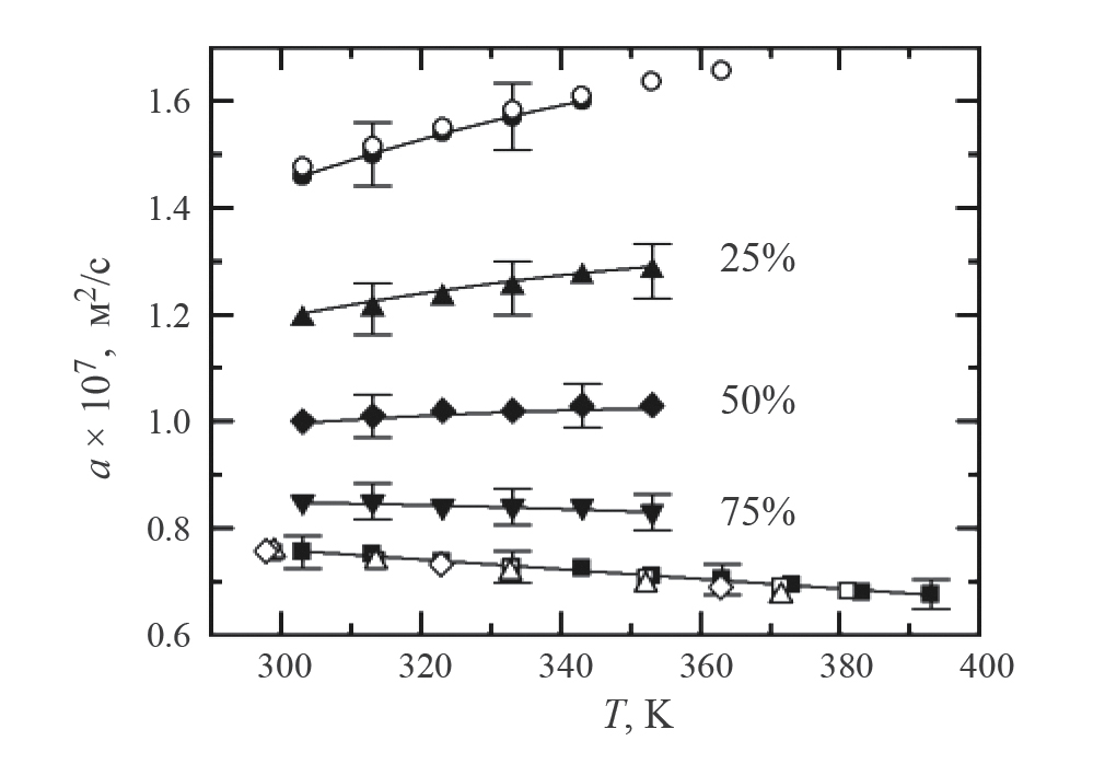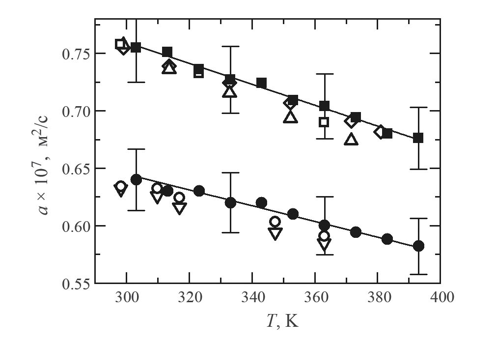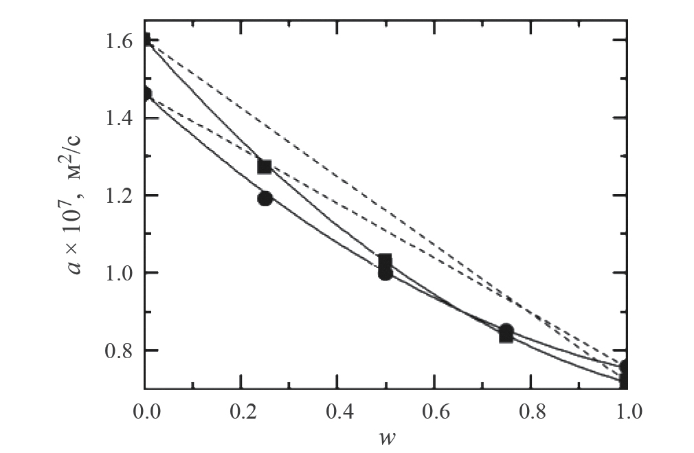 где температуропроводность чистых компонентов является функцией температуры и описывается (1), (2) со значениями коэффициентов bi, приведенными в табл. 2. В результате совместной обработки экспериментальных данных было рассчитано значение коэффициента k=0.6.