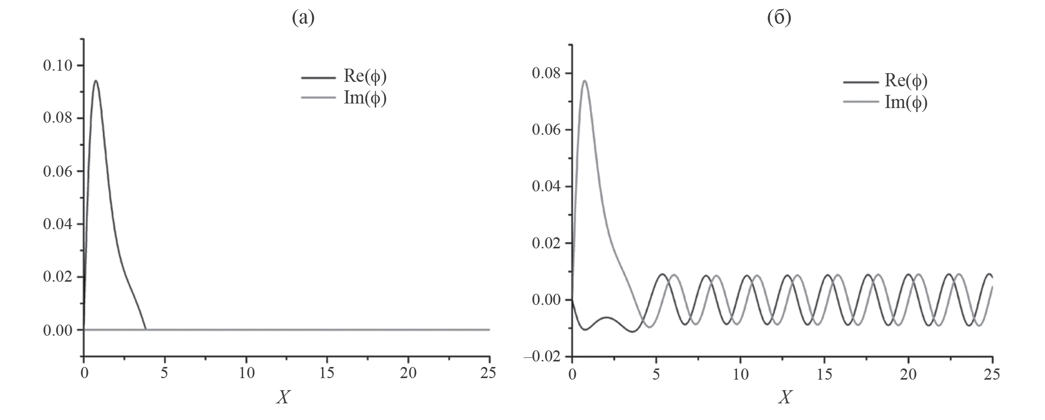 Рис. 6. Эволюция состояния AR-1: волновая функция в момент времени t = 0 (а) и t = T/2 (б). На оси абсцисс – координата в а. е.