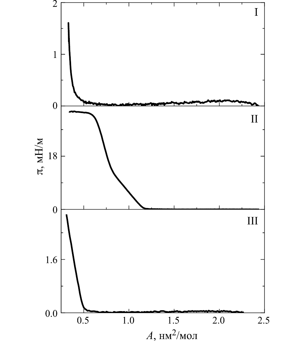 На рис. 4 приведены π–А-изотермы плавающих слоев порфиринов I–III. Как следует из сравнения Apack(face) и Apack(edge) с Amol, формируются плавающие слои порфиринов I–III с edge-on ориентацией, где молекулы в слое наклонены к поверхности воды.