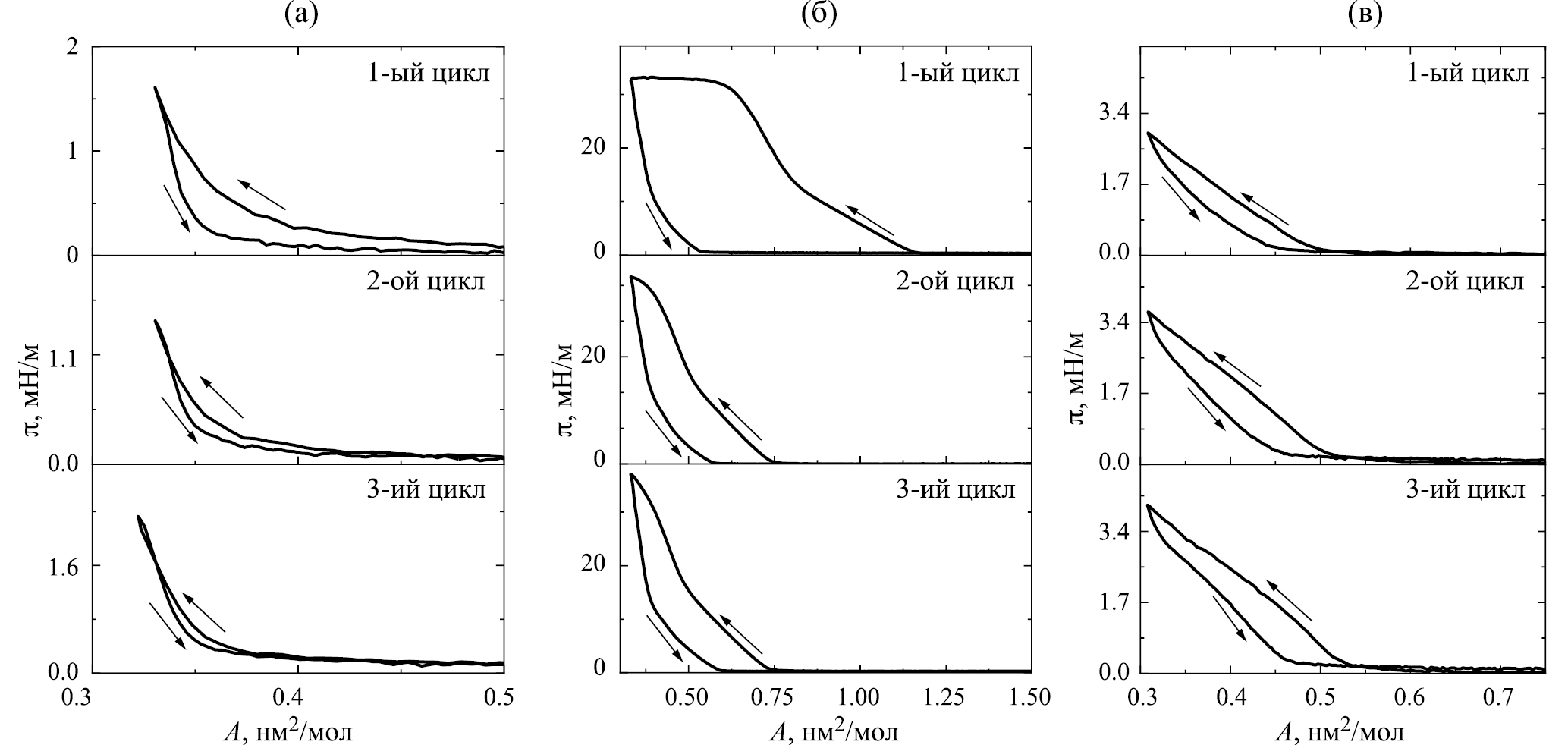 Важным подходом в рамках ленгмюровских методов является изучение влияния особенностей структуры молекул на процессы гистерезиса их плавающих слоев. Многие авторы обращаются к данному эксперименту для получения новой информации о формировании плавающего слоя, его реорганизации, стабильности и агрегации молекул [24, 35–40]. Появление петли гистерезиса объясняется сильными межмолекулярными взаимодействиями во время сжатия плавающего слоя [24–25, 35–40]. Кроме того, наличие петли гистерезиса (рис. 1) указывает на то, что плавающий слой сохраняет свою структуру при растяжении [41]. Это возможно только для слоя с высокоупорядоченной структурой. Отсутствие петли гистерезиса означает, что-либо образуется стабильное аморфное состояние, либо исходная структура плавающего слоя восстанавливается [41].