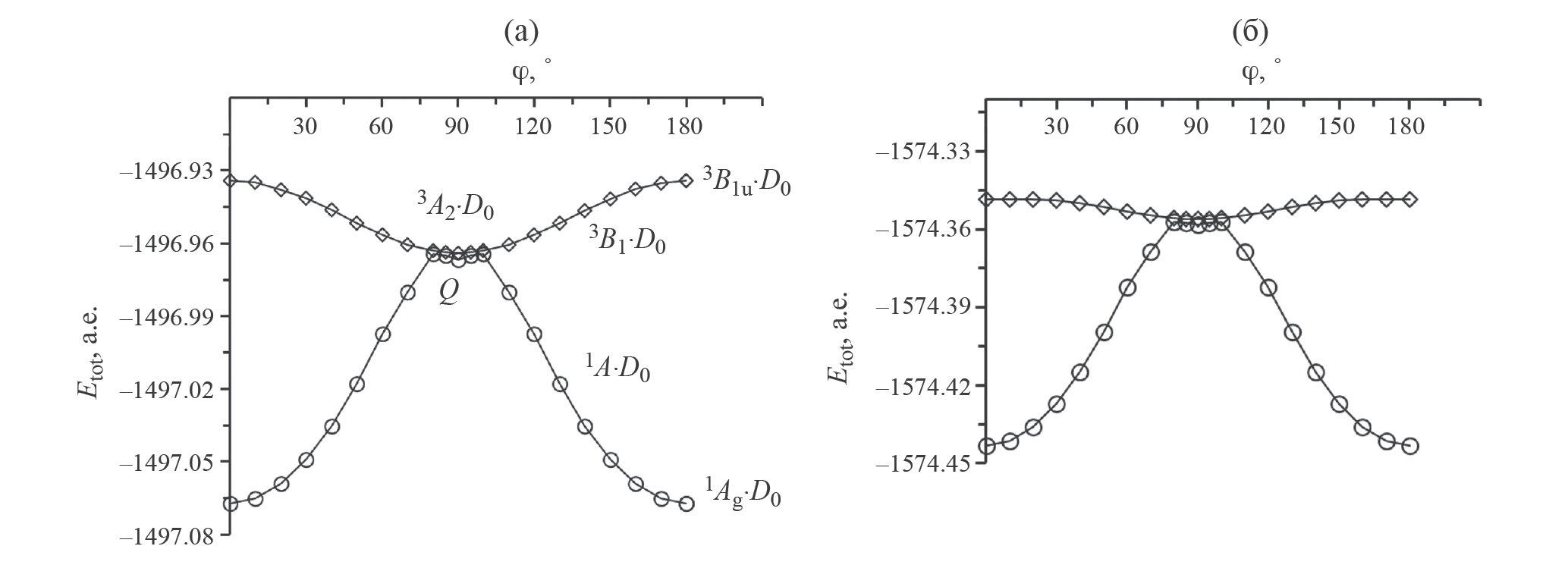 Из табл. 2 видно, что величина потенциального барьера ∆Еtot. имеет максимальное значение для основных дублетных состояний 1Ag·D0 комплексов C2H4(D2h)-CCl3 и s-транс-С4H6(C2h)-CCl3 и уменьшается при торсионном вращении метиленовой группы. Значение ∆Еtot. = 33.36 кДж/моль (7.98 ккал/моль) для комплекса C2H4(D2h)-CCl3 (состояние1Ag·D0) превышает среднее значение энергии активации 6.3 ккал/моль, определенной в результате кинетических исследований в [24], на 7.02 кДж/моль (1.68 ккал/моль). Как показано в табл. 2, минимальный барьер, для которого величина ∆Еtot. превышает абсолютную ошибку 1.68 ккал/моль, характерен для дублетных состояний 1A·D0 комплексов C2H4(D2)-CCl3 и s-транс-С4H6(C1)-CCl3 при ϕ=42° и 31° соответственно.