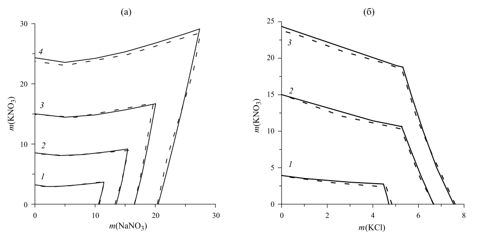 Рис. 1. Результаты расчета растворимости солей в системах: NaNO3 – KNO3 – H2O (а) при 293.15 (1), 323.15 (2), 348.15 (3), 373.15 K (4); KCl – KNO3 – H2O (б) при 298.15 (1), 348.15 (2), 373.15 K (3). Пунктир – результат расчета по модели из [12], сплошная линия – настоящая работа с параметрами из табл. 1, 2. На участках, где пунктир не виден, он сливается со сплошной линией.