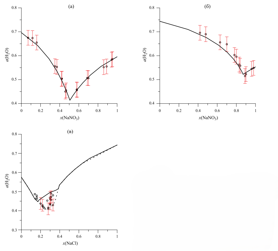 Более сложная ситуация с системой H2O–NaCl–KNO3. Как видно из рис. 7в, точки имеют заметно больший разброс, чем на графиках а и б, и не подчиняются явно выраженным закономерностям. Мы предполагаем, что причиной этого является наличие в системе области составов, где раствор насыщен по отношению к KCl. Из-за дефицита KCl в насыщенных растворах их состав оказывается смещен относительно плоскости NaCl–KNO3–H2O исходных составов в направлении к NaNO3. Тогда положение коноды, проведенной из вершины KCl через точку валового состава смеси, лежащей на этой плоскости, будет зависеть от доли воды в системе (т. е., состав насыщенного раствора будет изменяться при добавлении/удалении воды). В этом случае насыщенный раствор будет характеризоваться разными значениями aH2O и температурами кипения при постоянной массе солей, но разном содержании воды. Эту гипотезу подтверждают как данные работы [8], так и проведенные нами расчеты.