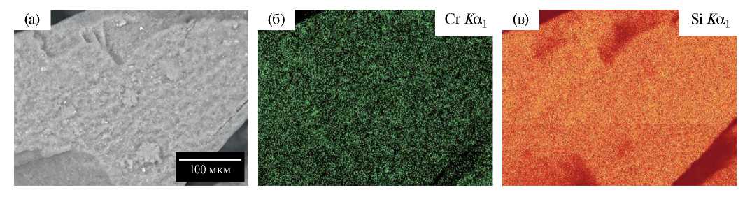 Рис. 2. Электронная микрофотография (а), карты по элементам для образца 5Cr/SiO2_CTMABr (б, в).