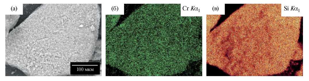 Рис. 4. Электронная микрофотография (а), карты по элементам для образца 5Cr/SiO2_cyclohexane (б, в).
