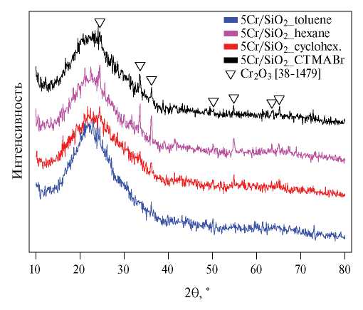 Фазовый состав образцов катализаторов исследовали методом рентгенофазового анализа. На рис. 6 представлены дифрактограммы образцов катализаторов. Для образцов 5Cr/SiO2_CTMABr и 5Cr/SiO2_hexane наблюдаются рефлексы, соответствующие кристаллической фазе α-Cr2O3, это связано с тем, что в первом случае речь идет о силикагеле, имеющем более мелкие поры, в том числе микропоры, – по-видимому, это может оказывать определенное влияние на кристаллизацию оксида хрома в порах. Отсутствие рефлексов фазы α-Cr2O3 для двух других образцов может указывать на высокую дисперсность частиц хрома на носителе SiO2, т. е. речь идет об аморфном состоянии частиц оксида хрома на поверхности.