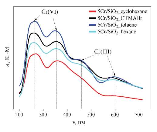 Несмотря на неколичественность определения содержания хрома на поверхности в различных степенях окисления, на качественном уровне можно сделать вывод о том, что по количеству шестивалентного хрома оксидные образцы образуют следующий ряд по убыванию: 5Cr/SiO2_toluene>5Cr/SiO2_CTMABr>5Cr/SiO2_hexane>5Cr/SiO2_cyclohexane. По содержанию трехвалентного оксида хрома образцы показывают такую же качественную зависимость, однако можно заметить, что по соотношению спектральных вкладов трех- и шестивалентного оксида спектр образца 5Cr/SiO2_hexane имеет наибольший вклад от трехвалентного оксида (по соотношению интенсивностей полос поглощения).