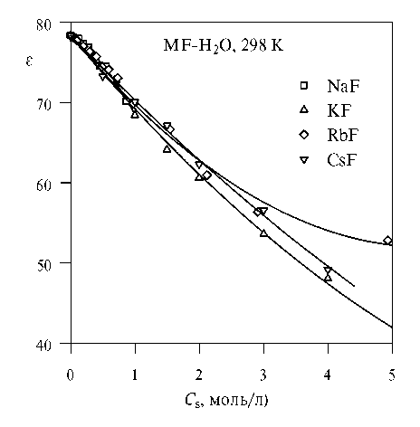 Таблица 1. Концентрационная зависимость статической диэлектрической проницаемости ε водных растворов фторидов щелочных металлов при 298 К на основе данных [14, 16, 17], cs – молярная концентрация соли (моль/л), cs, max, ms, max – максимальные молярная концентрация и моляльность соли в экспериментальных данных по ε